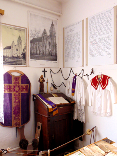Templomunk múltját, az onnan kapott néhány tárgy is reprezentálja. A régi fotók mellett néhány latin nyelvű egyházi irat, valamint a misézéshez használt miseruhák, karingek, stólák stb. láthatók.