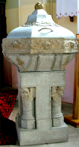 A bucsai Jézus Szíve templom keresztelő kútja - Kelemen Márton, győri szobrászművész alkotása. Az ezüstös fedelet Jézus töviskoronájával díszítette, jelezve a megváltás során szerzett kínszenvedését.