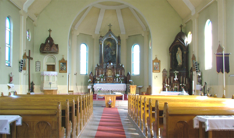 Templomunk belsőépítészeti jellegzetességei, a berendezések stílusa visszatükrözik a külső látványt, vagyis a neo-román építészet elemei megjelennek a templomhajóban és a szentélyben elhelyezett bútorzaton. A templom tornyán látható nyolcszögletű kupola több változatban is megtalálható a belső térben.